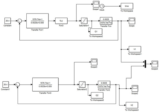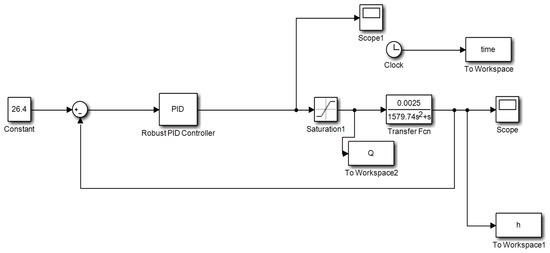 In order to further verify the effectiveness and energy-saving effect of the controller, the linear PID controller presented in [30], which was proved and testified to have good robust stability and control effect, was used to do the contrast experiments. During the simulation experiment, the sloshing phenomena and surface of the free liquid inside the tank were not considered, and the parameters of K and G were obtained by Equations (8) and (10), where T1 = 1, and the running time was 35,000 s. Figure 6 shows the system simulation block diagram and the link of program is in the Supplementary Materials.