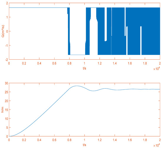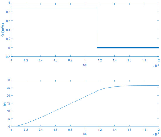 The input of the liquid level setting was a step signal with a value of 26.4 according to [27]. The controllers in Figure 3 were all designed by using the second-order closed-loop gain-shaping algorithm, and the upper part of Figure 3 uses the Gaussian function to decorate nonlinearly the output of the controller, while the lower part of the controller is undecorated. When the maximum loading capacity is 1.67 m3/s, the control output of the nonlinear decoration controller is 0.9100 m3/s (see Figure 4), reaching the set liquid level at a fast speed and completing the loading operation.