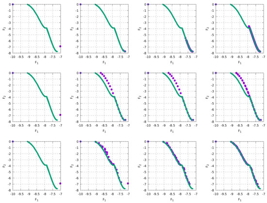 Pareto front approximation obtained by using the three methodologies separately. From top to bottom, the results obtained by applying only local resampling (top), Pareto front interpolation (middle) and NBI (bottom). From left to right, four different stages of evolution of the methodology. Green dots are the true Pareto front.