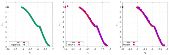 Pareto front approximation obtained by using the three methodologies sequentially, in comparison with a different optimization algorithm (NSGA-II and MOPSO). In the first picture at the left, NBI is compared with the true Pareto front. The other two pictures show the comparison of the results obtained by NBI versus NSGA-II and MOPSO respectively.