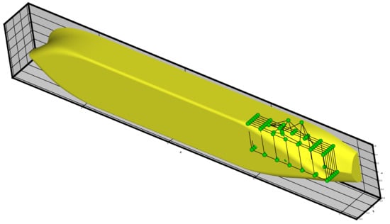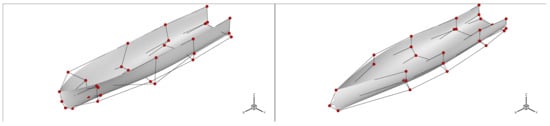 The parent hull to be modified and optimized is taken from the NPL series [11]. The 5A hull has been scaled up to an overall length 36 m, maximum width 6 m, moulded depth 4 m, mean draft when fully loaded 1.75 m, tonnage 200 tonnes. The hull surface has been replicated using a single Non-Uniform Rational Basis-Spline (NURBS—see the left image in Figure 3), and the control points represent the design parameters of the optimization problem. Every control point can move in every direction: the only fixed nodes are the ones at the bridge (locked in the vertical direction), at the stern (locked in the longitudinal direction) and the fore point on the bridge (locked in every direction). We have a total Number of Design Variables (NDV) of 21.