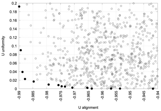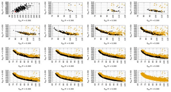 In order to further demonstrate the efficiency of the methodology, a second test case has been designed. For this test, the effective powers required by a ship advancing at two different speeds are the objectives of the multi-objective optimization problem. The two selected speeds are characterized by a nondimensional quantity (Froude number—): this is to emphasize the different flow regimes at the two different speeds. With we are in the displacement regime, where the lifting actions of the flow on the ship are negligible. With , we are in the semi-displacement regime, and the lifting actions are more intense, of the same order of magnitude of the buoyancy actions. Although the adopted flow solver is modeling the lifting forces in a simplified way, the results provided by the solver are reliable in both the two regimes. Furthermore, the use of two different flow regimes is reflected on the optimal shape, different for the range of application: typically, semi-displacement ships have finer bow entry and flatter aft with respect to displacement ships. For this reason, we are expecting different optimal shapes for the two objectives, and than a large Pareto front.