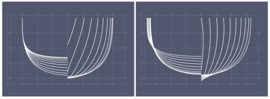 Comparison of the section views for the original (left) and the optimal (right) hull shapes for the effective power optimization problem.