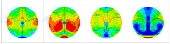 Flow at the propeller disk for four different configurations. From left to right, the original shape, the best shape for the first objective function, the configuration with the best balance between the two objectives and the best configuration for the second objective. Colors are representing the axial velocity of the flow, while the transverse component is indirectly reported by the streamtraces.