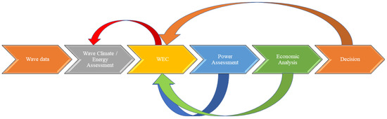 Pre- and post- production metrics are part of an overall process that seeks to identify and quantify basic energy, and subsequently economic characteristics of a WEC, reaching to a decision that will either be positive or negative. This simplified linear process analysis requires, at any step of the assessment, to go back and retain another WEC to refine the selection, and continuously update the content for the decision maker with the outcome of new economic and energy analysis (Figure 1). WEC techno-economic performance and optimization is therefore inherently dependent on high levels of wave–climate assessments. This is also the case for the selection of a WEC that requires a close match to local wave conditions.