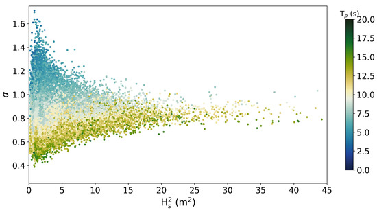 Evolution of the calibration coefficient between and () with respect to the significant wave height squared and the peak period at NDBC wave buoy 41,046 off the Bahamas (North-West Atlantic) adapted from [21].