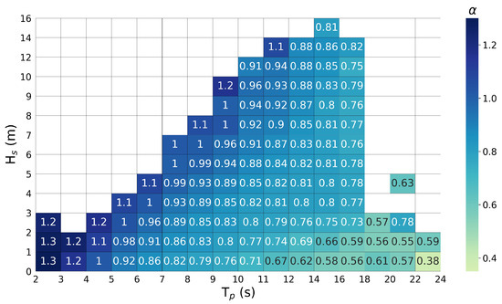 with B the device characteristic dimension. Babarit [36] introduced this parameter and estimated its value for a variety of WECs in diverse coastal locations, examining differences in energy performance. Since then several studies have relied on this metrics to examine and assess WEC power absorption potential e.g., [37,38,39]. Estimating wave energy depends, however, on the WEC power matrix , which represents the equivalent power curves by providing the energy produced among wave heights and periods. Depending on the WEC technology, geometrical characteristics (size, weight, etc.), response amplitudes and excitation forces will differ; and this will directly influence the power produced by WEC for given metocean conditions [40,41]. According to best practices, estimating WEC energy output requires the combination of wave scatter diagrams with device power matrix as Equation (6)