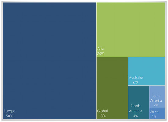 Although these approaches may be useful in the first step of a wave energy project, refined assessments of the wave resource must be conducted by relying on dedicated numerical simulations. Indeed, numerical wave models are power tools that, if used properly, can offer a plethora of valuable spectral information, reducing uncertainties in wave energy resource assessments. Given the minimum duration of necessary data, we gathered all literature associated with wave energy estimation from use of numerical wave models. Our focus was put on scientific studies that integrated an extended description of the calibration and validation procedures. Although other wave–climate databases exist (usually under commercial status), our analysis focused on specific topic publications addressing wave energy resource assessments. In total more than one hundred studies were gathered, predominantly applied in the European shelf seas where a considerable number of technological devices was developed and tested (Figure 5). We here reviewed the different numerical modelling considered for wave energy resource assessments, considering (i) basic simulations dedicated to compute the power density from the distribution of energy spectrum over frequencies and directions and (ii) more complex approaches that integrated the effects of tidal currents or WEC energy extraction on the wave field.