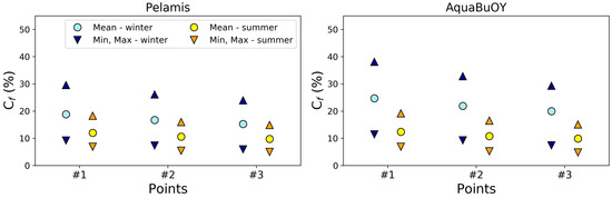 CF accounts for the fraction of the time the energy converter is operating at full capacity. Higher CF values account therefore for an improved use of a device in terms of power production whereas lower CF values exhibit improper WEC technologies at the location considered. As in any other renewable energy, the intra-annual, seasonal and monthly variabilities of the wave resource may have a major effect on the capacity factor [6]. CF values thus depend on the adaptability of the WEC technology to a given wave climate. Indeed, high rated WEC will require high energy levels, and will show reduced performance in locations with moderate resources; hence CF is dependent on WEC selection e.g., [6,24,42]. Availability of production is another metric that is considered to determine WEC operations between a start limit and an upper limit . Such analysis can be considered in different ways, but usually availability refers to start (cut-in) and end (cut-out) thresholds for the useful operation of a WEC [43].