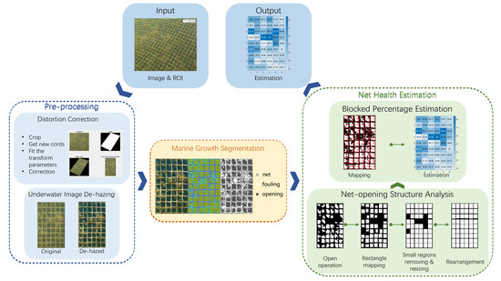 To ensure the universality, stability, and effectiveness of the proposed Net Health State Estimation (NHSE) algorithm, three modules: pre-processing, marine growth segmentation, and net health estimation modules are designed as shown in Figure 1. For any input underwater image, Region of Interest (RoI) is selected and corrected for further segmentation. The image de-hazing method [11] is introduced to achieve a more accurate and better visualization. Subsequently, we utilize the k-means algorithm to separate the regions of net, bio-fouling, and net-opening. According to the segmentation results, a net-opening structure analysis method is proposed to calculate the number of cells, which greatly affected the results of estimation. Finally, we take both segmentation and structure into consideration to estimate the blocking percentage of each cell.
