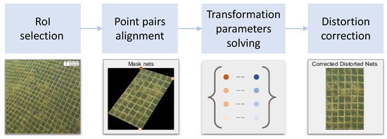 Thus, there are eight unknowns need to be solved as shown in Equation (4). In other words, we need four pairs of points to fit the perspective transformation in this study. Fortunately, four points are selected to determine RoI and also can be used to solve Equation (4). Figure 3 shows the flowchart of distortion correction. In step 2, point pairs alignment is introduced to calculate the new coordinates in cropped plane C, and then get the coordinates in correction plan according to relative location of selected points in plane C. The transformation parameters will be solved in step 3 by Equation (4).