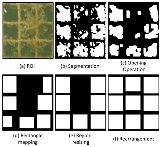There are four steps in this part: morphology operation, rectangle mapping, small regions removing and resizing, and rearrangement. Morphology operation is introduced to remove the isolated regions and keep cell regions separated as shown in Figure 6b,c. In this study, we use image opening operation (∘) described as: