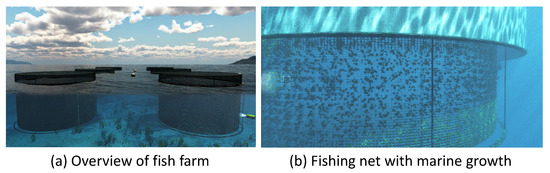 The virtual fishing farm. (a) overview of fish farm; and (b) fishing net with marine growth.