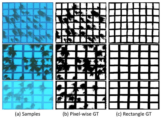 Samples generated from raw images. (a) samples; (b) pixel-wise ground-truth; and (c) rectangle ground-truth.