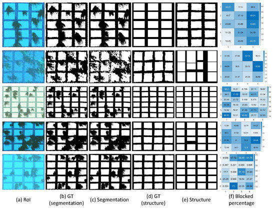 Again, for virtual scenes, as shown in Figure 13, samples in different virtual scenes are selected. The segmentation results and structure estimation results are consistent with GT in most cases, and accurate blocked percentage estimation results are obtained. The sample in row two, which is collected from the boundary part of the raw Right/Left view image, has some distortion in color and more noise, which leads to unsatisfactory structure estimation result, while the blocked percentage basically consistent results with GT. It further illustrates the stability of the algorithm in extreme cases.