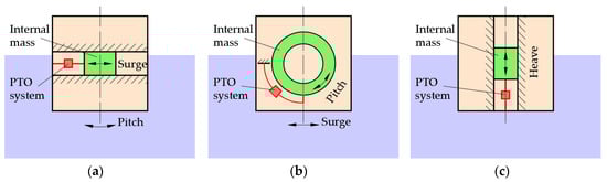 Working principle of power absorption systems in the three degrees of freedom: (a) surge; (b) pitch; (c) heave.