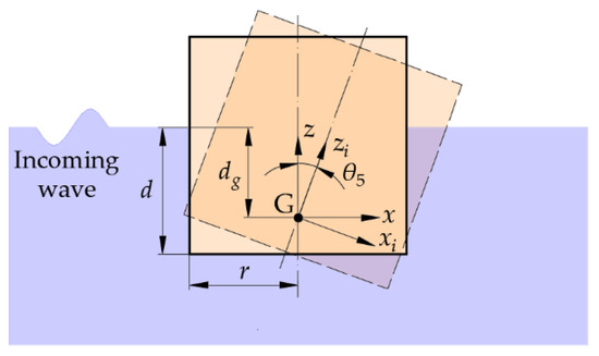 The hydrostatic restoring moment in pitch Ms5 is obtained as follows. Coordinates systems of the buoy are shown in Figure 3, including a global fixed coordinate system G-xyz and a body-fitted coordinates system G-xiyizi. Then, the hydrostatic restoring moment of the buoy in pitch is