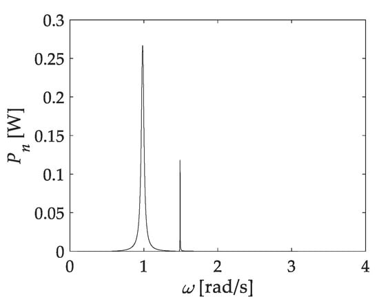 It has been revealed in [8,32] that a point absorber that reacts against an internal mass has a narrower bandwidth of the wave frequency for power absorption when compared to a point absorber reacting against an external submerged resistive plate. This suggests that, when discretizing the wave spectrum, the sampling interval of the wave frequency should be as small as possible. Figure 6 shows an example of the component power as a function of the sampling frequency when wave power is absorbed in surge. It is found that the absorbed power is concentrated at two narrow frequency ranges, i.e., around 0.98 and 1.49 rad/s, resulting from being close to the two natural frequencies of the WEC. Due to the narrow power absorption bandwidth, a highly accurate value of the absorbed power, which in irregular waves is the summation of the component power, requires that the sampling interval of the frequency is sufficiently small, which is chosen to be 2 × 10−5 rad/s in this work.