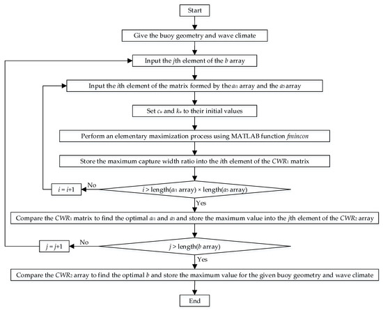 The maximum power absorption can be found when parameters of the point absorber are optimized, whose flowchart is shown in Figure 7. For a given buoy geometry, wave climate, depth ratio of the center of mass b, internal mass ratio ai1 and rotational inertia ratio in pitch a5, we can find the maximum absorbed power of the buoy through an elementary maximization process with the objective function defined by Equation (26). To perform this elementary maximization, the MATLAB function fmincon, which employs the interior point algorithm, is adopted. In this process, initial values of cu and ku should be set as an initial guess of the optimal solution. Based on this maximization process, the maximum absorbed power can be found as a function of the internal mass ratio ai1 and rotational inertia ratio in pitch a5. Then, the maximum absorbed power and the optimal value of ai1 and a5 can be determined for the given buoy geometry, wave climate and depth ratio of the center of mass b. Repeating the above steps for different b, we can find the maximum absorbed power as a function of the depth ratio of the center of mass. Finally, by analyzing the changing trend of the absorbed power with respect to b, the maximum absorbed power and the corresponding optimal b can be determined for this particular buoy geometry and wave climate. Since the elementary maximization process is in the innermost loop of the optimization procedure, in each scenario of the non-dimensional parameters, e.g., ai1, ai3, ai5 a5, and b, the maximum absorbed power is obtained with this elementary maximization process be executed, resulting in the PTO parameters being optimal.