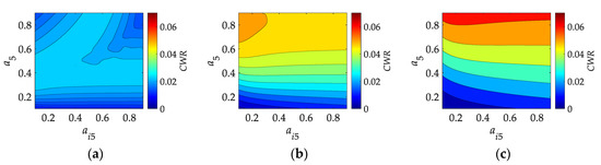 An example of the maximum capture width ratio CWR as a function of the internal mass ratio ai1 and the rotational inertia ratio in pitch a5 at different depth ratios of the center of mass b for the buoy geometry of r = 4 m, d = 4 m and the wave climate of Te = 8 s: (a) b = 0.5; (b) b = 0.75; (c) b = 0.9.