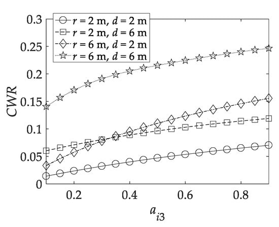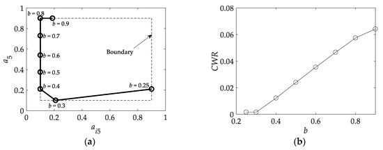 The maximum capture width ratio CWR as a function of the internal and total rotational inertia ratio in pitch, ai5 and a5, at different depths of the center of mass b for the buoy geometry of r = 4 m, d = 4 m and wave climate of Te = 8 s: (a) b = 0.5; (b) b = 0.75; (c) b = 0.9.