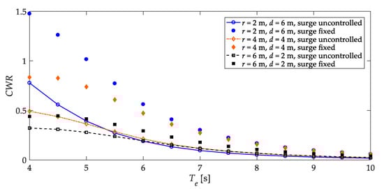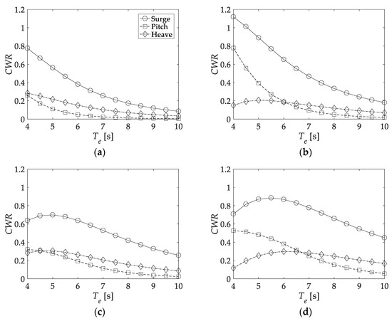 Capture width ratio CWR as a function of the energy period Te at different buoy geometries: (a) r = 2 m, d = 2 m; (b) r = 2 m, d = 6 m; (c) r = 6 m, d = 2 m; (d) r = 6 m, d = 6 m.