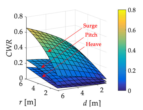 Figure 16 shows an example of the capture width ratio as a function of the buoy geometry at different power-absorption degrees of freedom and the energy period of 8 s. It can be seen that, within the buoy-geometry range of interest, power absorption in surge always captures more power than both pitch and heave. Combined with the observation above, we found that surge may be the best degree of freedom for a vertical cylindrical buoy that extracts wave power by reacting against an internal mass.