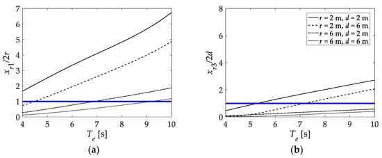 Relative displacement amplitude between the internal mass and the buoy, xr1 and xr3, non-dimensionalized by the radius r and draft d of the buoy when wave power is absorbed in respectively surge (a) and heave (b) as a function of the energy period at the significant wave height of 2 m.