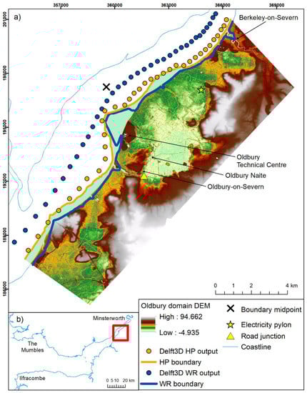The Delft3D modeling system has been previously validated and successfully used to simulate coastal hazards in the Severn Estuary for two historic storm events; (i) 3 January 2014 (hereafter called January 14) which represents the maximum coastal hazard condition; and (ii) 16 December 2012 (hereafter called December 12) which represents the 90th percentile coastal hazard condition, represented by WL + ½ Hs []. These storm events coincide with winds from a southwest-west direction at the time of high water, as wave hazard is amplified up-estuary with winds from this direction []. Flood warnings were issued along large stretches of the Oldbury coastline for the 3 January 2014 storm event, and flooding was reported 10 km further up-estuary locations in the Severn Estuary at Minsterworth as defences were overwashed [].