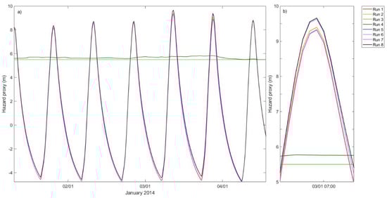 Figure 6b shows flood hazard rating for January 14 at the pylon. Run 8 and 6 (Figure 6b) exceed all thresholds when using the WR approach, representing a danger to some and to all. The moderate threshold is exceeded for up to 1 h 53 min, and the extreme threshold is exceeded for 1 h 4 min. When using the WR approach, run 8 and 6 represents 1 h 53 min that the pylon would not be accessible; however, the moderate threshold is not exceeded when using the HP approach, indicating that the pylon would be accessible. Sensitivity in the hazard time series curves for run 8 and 6 covers all thresholds, meaning emergency planning is difficult; a flood event could mean the pylon is or is not accessible.