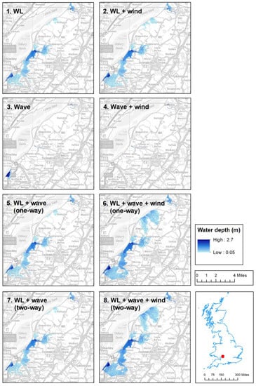 Uncertainty refers here to a lack of sureness about a specific parameter, e.g., HWL or HWHs, where a range of possible values may exist for a single variable within which exposure or impacts could occur [], and can occur due to misrepresentation of physical processes in numerical models []. Inaccurate representation of the complex interactions between atmospheric, meteorological, fluvial and tidal processes in estuaries can propagate through the modelling chain and result in large uncertainties in the hydrodynamic forcing of process-based and shoreline response models [], and have been shown to cause uncertainties in subsequent model outputs. The exclusion of locally generated winds underestimated HWHs by up to 90.1% in the upper regions of the Severn Estuary, southwest England, during simulations of the 3 January 2014 storm event []. Excluding the contribution of riverine discharge to total water level during simulations of a storm-tide, using hydrodynamic modeling package Delft3D, underestimates flood extent by 30% (20.5 km2) in the Shoalhaven Estuary, south-eastern Australia []. LISFLOOD-FP, a 2D inundation model, has been used to show that uncertainties in boundary conditions are an important factor in the accurate prediction of inundation of the coastal city of Licata, in the Imera basin, Sicily, as this determines whether or not rivers are in flood and reach bankfull stage and discharge []. LISFLOOD-FP has also been used to show the differential flood risk from different combinations of storm return period, wave overtopping and river discharge in Fleetwood, northwest England, and quantified economic impact []. LISFLOOD-FP has also been used to assess the sensitivity of future coastal flooding in the Severn Estuary, given uncertainty over possible mean sea-level rise and storm surge climate [,,]. Accurate estimation of still water-level, wave setup and runup is crucial for accurate representation of peak storm tides, and may be more important in a coastal inundation model than intra-modeling uncertainties, such as bed roughness coefficients and input conditions []. There is a need to accurately predict HWL and HWHs for flood hazard management and quantify uncertainties in hydrodynamic models due to the parameterisation and interaction of physical processes when used to force process-based and shoreline response models, for example inundation or hydro-morphological models.