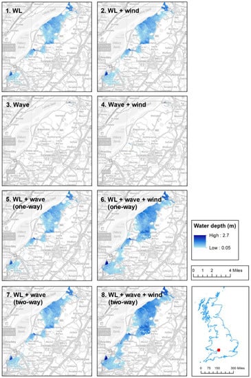 Uncoupled model scenarios represent standalone water level simulations in FLOW, which use a time-varying, spatially uniform WL boundary, or wave simulations in WAVE, which superimpose time- and spatially-varying Hs on a constant total water level at mean high water spring tide, taken from Ilfracombe tide gauge. Mean high water spring tide represents a HWL which could present a hazard to coastal zones. One-way coupled scenarios represent the influence of currents on waves, and two-way scenarios represent the influence of currents on waves, and waves on currents. Simulations were forced with and without local wind conditions, originating from the Met Office global unified model [] and extracted from the Extended Area Continental Shelf Model CS3X [] to represent changing forcing processes. All simulations were forced with river gauge data from the Environment Agency Sandhurst river gauge near Gloucester at the eastern open boundary. Run 8 represents a complete, 5-parameter multi-hazard simulation and outputs were graphically and statistically validated to tide gauges and wave buoys in the estuary [,]. The results of the Delft3D runs were used to force the boundary of the LISFLOOD-FP Oldbury model domains to represent coastal hazard uncertainty.