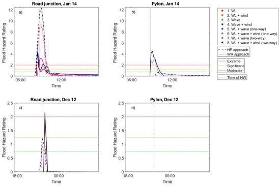 Flood hazard rating during the January 14 event at (a) road junction; (b) pylon; and during December 12 event at (c) road junction; and (d) pylon using the HP (dashed black line) and WR approach (solid black line). Modelled tidal signal at the boundary midpoint (vertical dotted black line) and extreme (red, horizontal dotted line), significant (amber, horizontal dotted line) and moderate (green, horizontal dotted line) thresholds for hazard to people [].