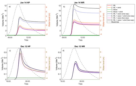 Change in volume of inundation (Mm3) in the Oldbury model domain for January 14 forced by (a) HP and (b) WR; and December 12 forced by (c) HP and (d) WR. Modelled high tide from low water to low water is also shown (dashed line).