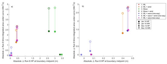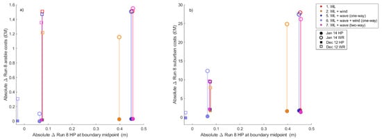 Figure 8a shows that there is substantial difference in HP at the boundary midpoint (location shown in Figure 1a and time-integrated volume of inundation between run 3 and 4 with run 8 for the January 14 (green circles). Coastal hazard uncertainty generates up to 3.46 m difference in HP at the boundary midpoint between run 3 and 8 for December 12, and 3 m for January 14.