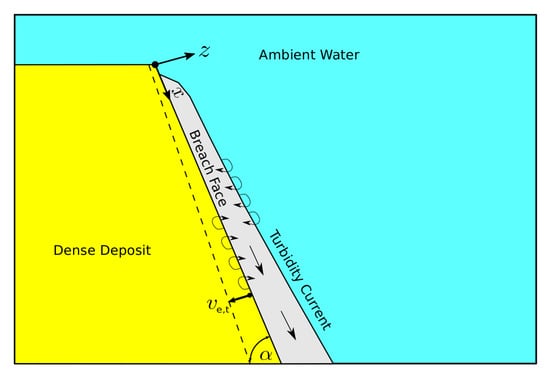 - Alhaddad, S.; Labeur, R.J.; Uijttewaal, W. Breaching Flow Slides and the Associated Turbidity Current. J. Mar. Sci. Eng. 2020, 8, 67. [Google Scholar] [CrossRef]