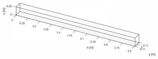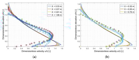 The computational mesh consists of a total number of about 46 million cells. To reduce the computational time, grid clustering was used in x-direction; a width of 2 mm was used for the cells in the first 1.5 m, while the width of the remaining cells was gradually increased with a growth rate of 1.04 with an upper limit of 5 cm. The cell dimensions in the y and z directions were kept constant with a value of 2 mm and 0.5 mm, respectively (leading to maximum for the first velocity point located at ). The average computational time of the runs presented in this study was about 4 days.