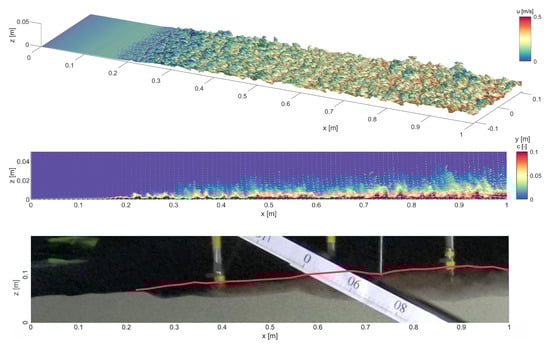 An instantaneous 3D view of the isosurface c = 0.01 at time = 8 s (Run 3); colors indicate the magnitude of the streamwise velocity (top). An instantaneous 2D vertical slice at y = 0 at time = 8 s (Run 3); colors indicate the magnitude of the sediment concentration c and vectors indicate the magnitude and direction of the streamwise and bed-normal velocities in this plane (middle). An instantaneous, experimental side view of the spatial development of the flow over a 64 breach face [18]; the flow propagates from left to right and the red line corresponds to the visual upper boundary of the flow (bottom).