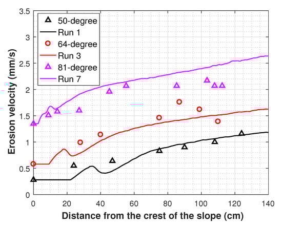 To evaluate the proposed breaching erosion model and the morphodynamic response associated with the turbidity currents, simulation results are compared against the corresponding experimental data (see Figure 6). For each of the numerical runs, the constructed erosion velocities are the average magnitudes over a 3-second time span and a lateral distance of the first 10% of the domain width (2.2 cm). This is because the erosion velocities reported in [18] were computed from the video recordings filmed through the glass wall.
