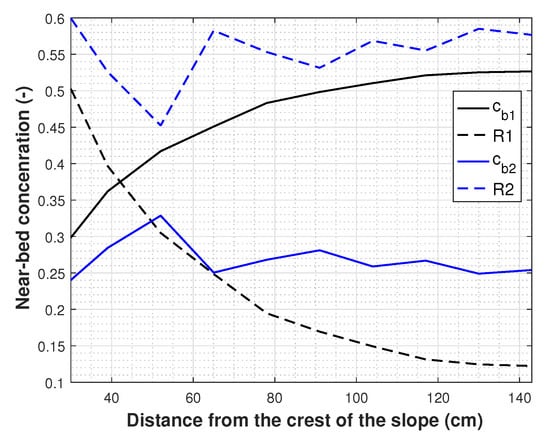 To elaborate on this hypothesis, we show in Figure 7 two different definitions of the near-bed concentration and the corresponding reduction factor R; is the concentration of the first cell above the bed, while is the average concentration in the inner region. The value of tends to become constant downslope and consequently the reduction factor also remains constant. In contrast, rapidly increases in the downstream direction and hence the reduction factor rapidly decreases. This implies that at some point along the breach face, the increase in bed shear stress will be balanced by the increase of the near-bed concentration, transforming the flow from the self-acceleration mode to the bypass mode. In conclusion, the definition of the near-bed concentration influences the computed erosion rates and, consequently, might influence the flow mode.