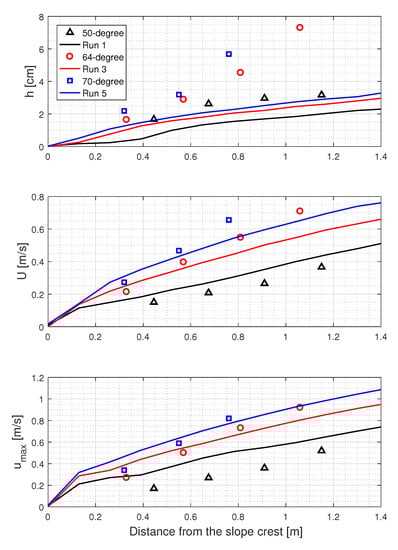 The characterizing layer thicknesses h and depth-averaged velocities U for Run 1, Run 3 and Run 5 are constructed and compared with corresponding magnitudes derived from the laboratory experiments. These flow characteristics, h and U, are calculated using the following relationships [14,26,54]: