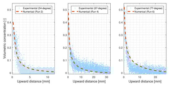 The experimental data suggests a transition in the erosion rate after a certain point. For example, in the case of the 81 breach face, the observed erosion velocity is found to be almost constant in the streamwise distance 55–110 cm. It could be that the in situ porosity was not uniform all over the breach face (see Section 6.6 for the effect of ). Another hypothesis is that the current was in the bypass mode (the current maintains the sediment load), but that is not captured in the numerical model. This may be attributed to the reference line of the near-bed concentration, which should be defined based on the dimensions of the turbulent eddies transporting the sand grains from the turbidity current back to the breach face. The size of those eddies was not considered in [18] as that requires experimental data of higher resolution.