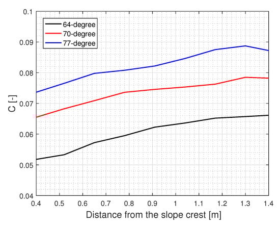Figure 11 depicts the spatial development of the layer-averaged concentration C (Equation (23)) for three slope angles. Clearly, steeper slopes result in a higher C owing to the higher sediment erosion. The results show that C increases in the downstream direction, in the same manner as the layer-averaged velocity U (see Figure 8). This supports the conclusion drawn by [18] that breaching-generated turbidity currents are self-accelerating. According to [56], self-accelerating flow is characterized by the downstream increase of flow velocity, which is caused by downstream increase in suspended sediment concentration.