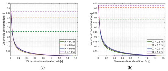 Composite plot of numerical concentration profiles spaced by a distance of 0.3 m: (a) 64 breach face (Run 3); (b) 77 breach face (Run 6); horizontal dashed lines refer to the concentration maximum.