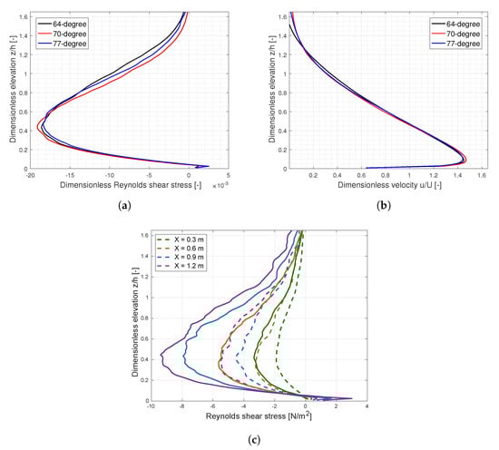 The Reynolds stresses are calculated using the turbulent velocity components averaged over a 3-second time span. For three different slopes at x = 1 m, Reynolds stresses are normalized by and their distribution is shown in Figure 13a. The Reynolds stress increases significantly near the breach face, reaching the largest positive Reynolds stress at z/h ∼ 0.025, where the bottom boundary layer ends. Around and below the velocity maximum, z/h = 0.045–0.085, Reynolds stresses are close to zero. Further upwards, in the outer region of the flow, where the velocity gradient is negative, Reynolds stresses become negative, reaching the largest negative Reynolds stress at z/h ∼ 0.45. This elevation has the largest negative velocity gradient. Above this elevation, Reynolds stresses decreases towards nearly zero at the upper boundary of the flow. It is found that Reynolds stresses take a self-similar shape.