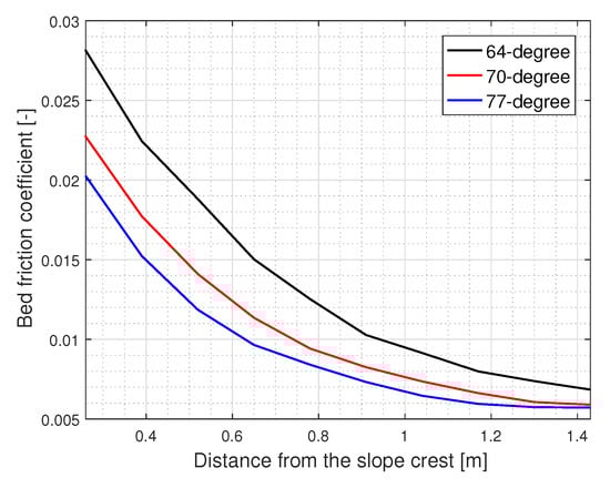 The calculated values of show that the bed friction coefficient is not a constant parameter (Figure 15); it decreases downslope. This is because the thickness of the current increases along the streamwise direction, resulting in an increased bulk Reynolds number and, consequently, a decreased drag coefficient. The results also show that steeper slopes lead to a lower bed friction coefficient. For the considered slope angles and traveling distance, ranges from 0.028 to 0.006 with an average value of 0.011. This is consistent with the range of values reported in the literature (e.g., [54]).