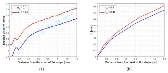 The experiments of [18] were all conducted using a constant sand in situ porosity = 0.4. To investigate the effect of on the flow and erosion velocity, an additional numerical simulation for 67 breach face was run using = 0.44, which corresponds to a sand relative density of 68%. A comparison between the numerical results for = 0.4 (Run 4) and = 0.44 (Run 8) is shown in Figure 16. It can be seen from Figure 16a that higher results in higher pure breaching and hence higher erosion velocities downslope; the average increase in erosion, in the considered case, is significant (47%). Higher leads to a lower hydraulic gradient (which acts as a stabilizing force) during shearing, increasing the erosion velocity. As a result, the flow becomes denser and runs faster downslope, as depicted in Figure 16b. The difference of the layer-averaged velocities between the two runs is magnified downstream.