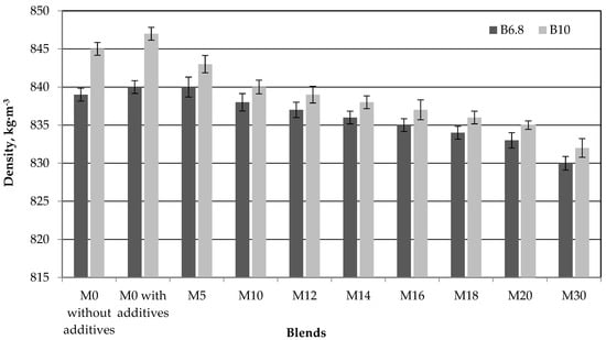 Results of the density test of the two diesel–biodiesel blends (B6.8 and B10; B: biodiesel percentage) as a function of methanol content (where M is the methanol percentage; M0 = 0% to M30 = 30% methanol). Error bars show the standard deviation.