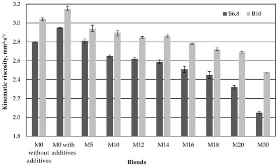Results of the test of the kinematic viscosity of the two diesel–biodiesel blends (B6.8 and B10) as a function of methanol content. Error bars show the standard deviation.