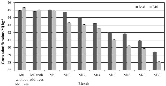 During the analysis of the gross calorific values of blends, it was found that B10M0 (blend without additives) had a maximum calorific value of 45.358 MJ kg−1 (Figure 3). The addition of fuel additives reduced the gross calorific value by 0.27% to 45.028 MJ kg−1. Similar to the previous properties, increasing the methanol content from 5 to 30% (volume basis) in blends with additives resulted in a decrease in calorific value.
